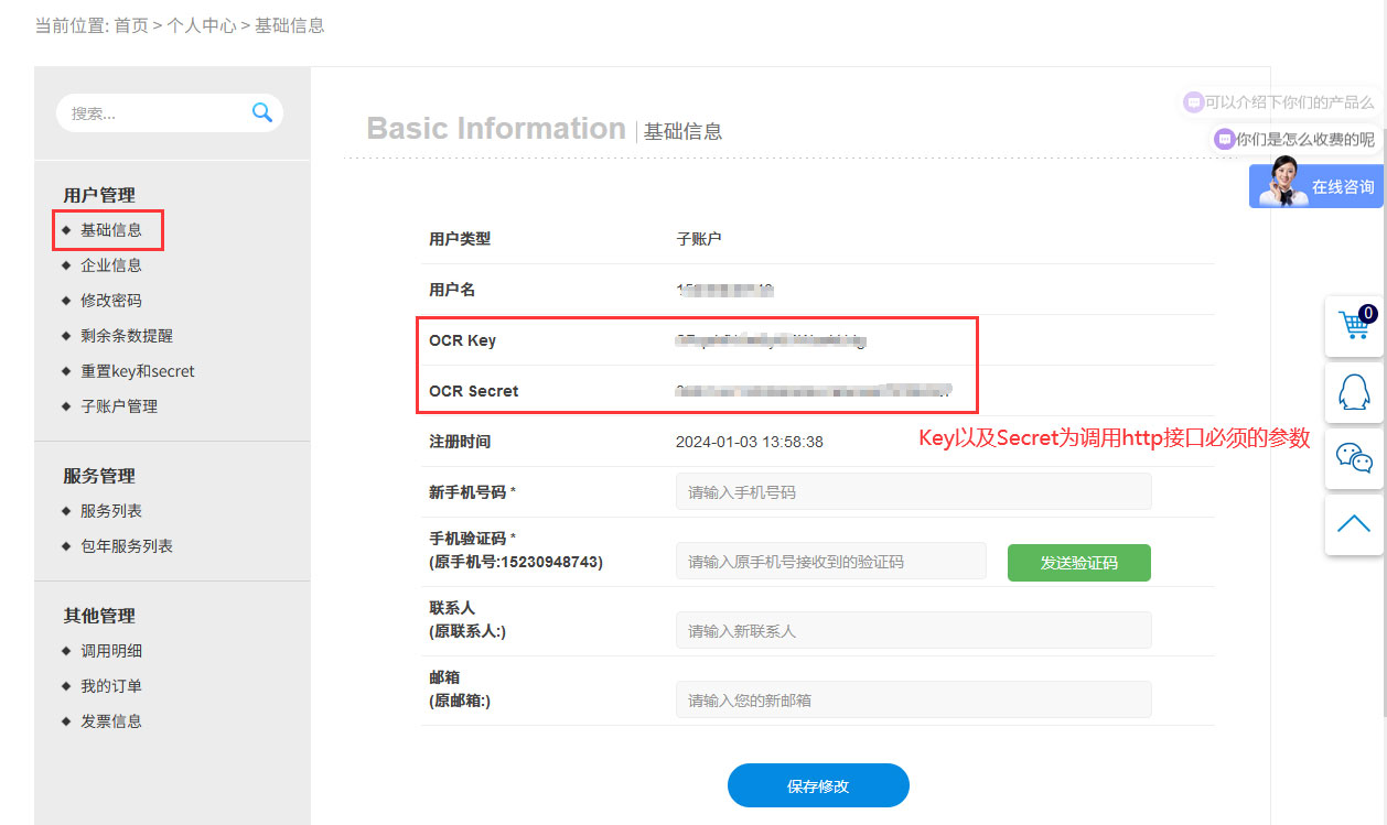 (2)点击“用户管理-基础信息”,查看OCRKey以及OCRSecret: