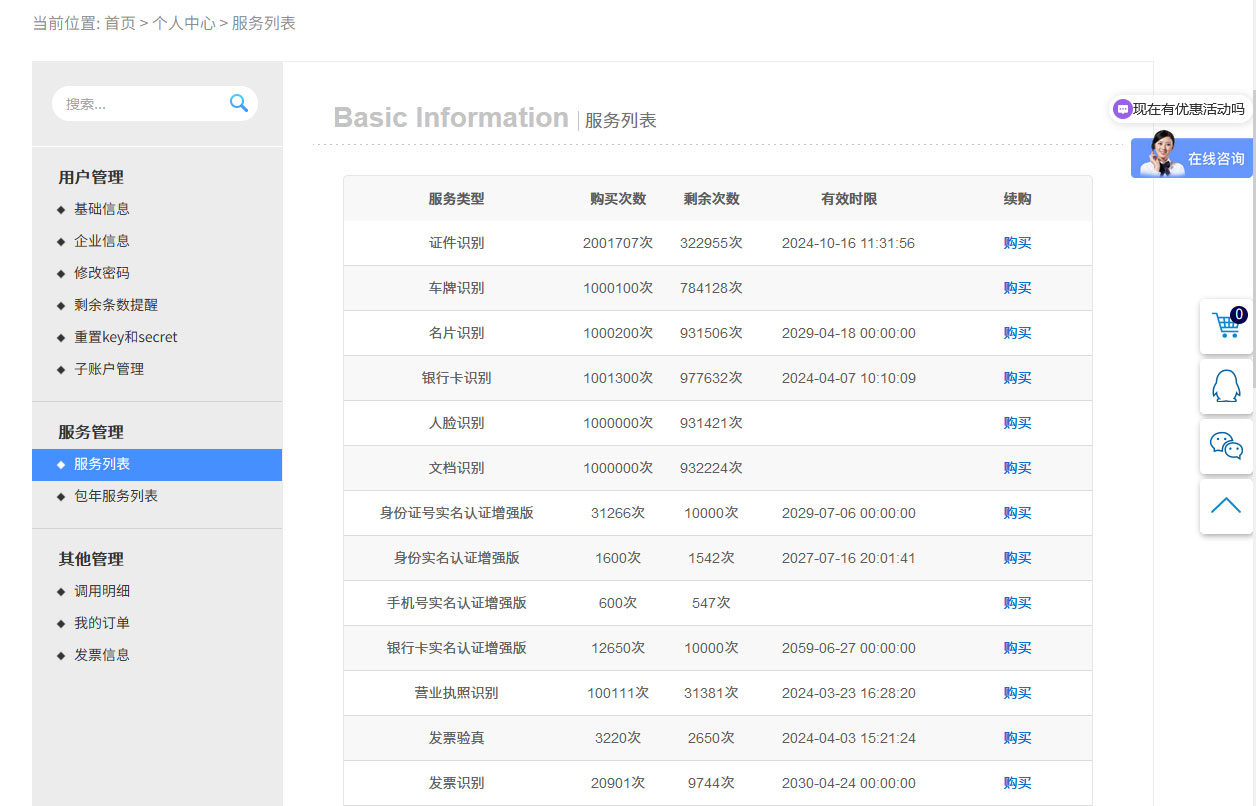 (3)续购:登陆后进入个人中心-服务类型页面,可通过已购买服务右侧得“购买”直接跳转到购买页面续购API服务次数。购买成功后,会显示购买的总次数及剩余次数。