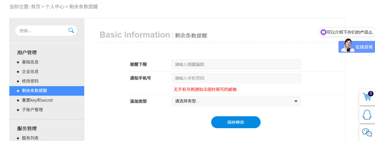 (4)设置剩余条数提醒,进入个人中心-用户管理-剩余次数提醒,设置提醒API服务剩余次数的下限、收取通知邮箱(手机号)及服务类型,设置成功后到达用户设置的服务剩余次数下限,系统会发邮件至预留邮箱或手机号短信。
